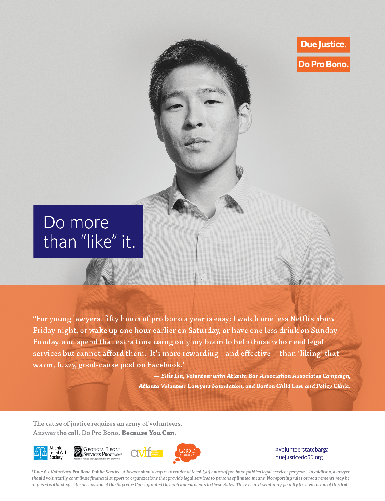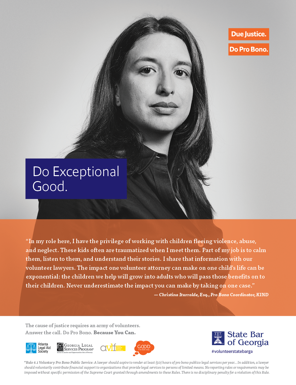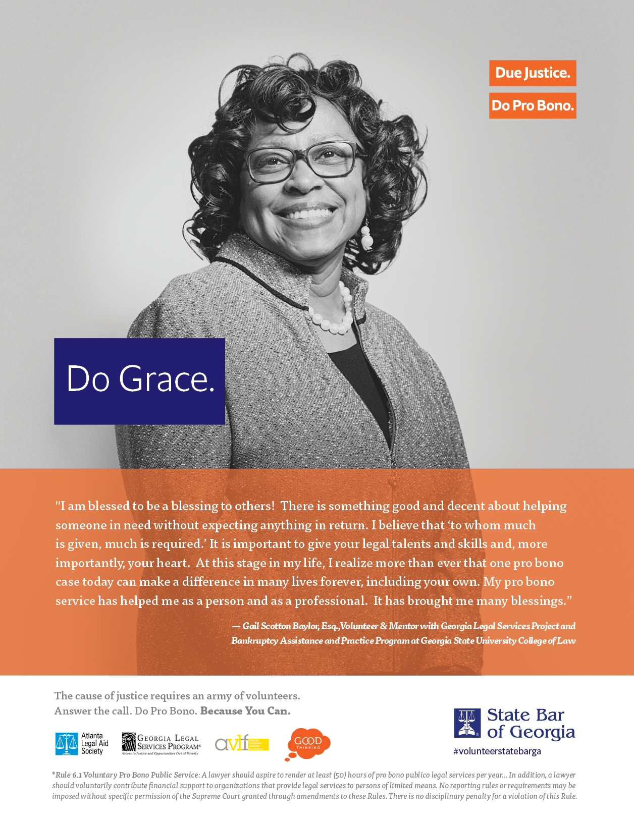 The State Bar of Georgia encourages lawyers to provide at least 50 hours of pro bono services each year and contribute financially to legal aid and pro bono programs. Volunteer lawyers across the state make a difference for people who otherwise cannot afford representation to resolve a critical legal problem. Georgia Bar Rule 6.1 provides information on hours and service types that are considered pro bono activities.